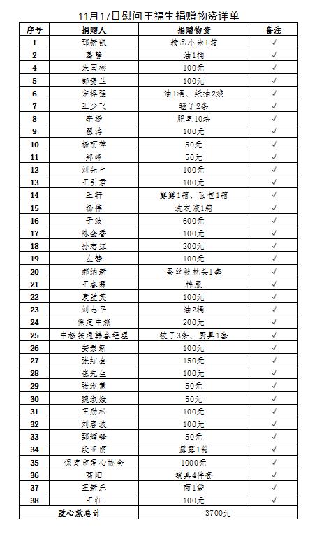 11月17日慰问贫困家庭王福生捐赠物资详单